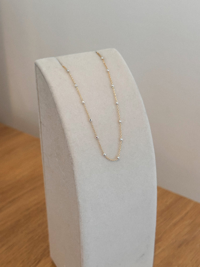 Made of 14k gold fill with sterling silver beaded accents, water resistant. The best layering piece.